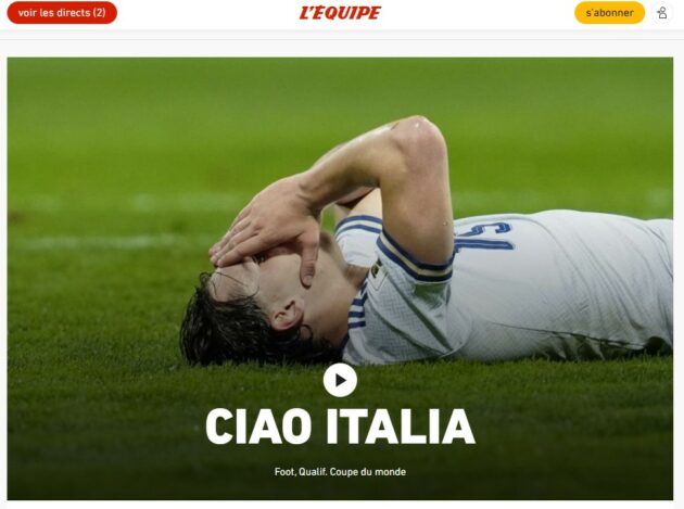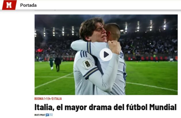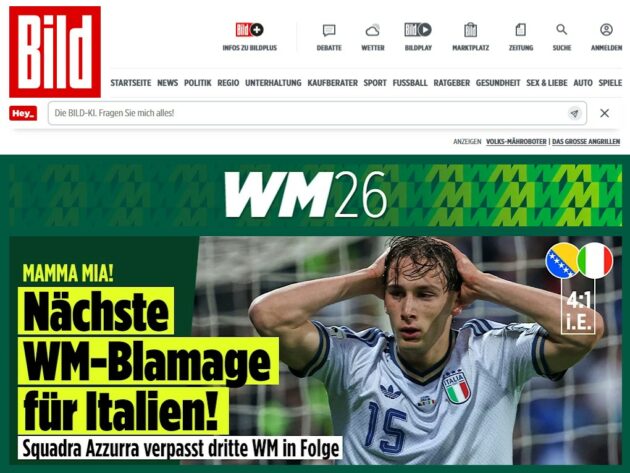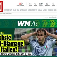 “Un’altra figuraccia per l’Italia ai Mondiali!”: è il titolo d’apertura della Bild, rinomato quotidiano tedesco sportivo, dopo il terzo fallimento consecutivo della Nazionale azzurra. 2018, 2022 e 2026: l’Italia ha mancato ancora una volta l’accesso alla Coppa del Mondo. Questa volta contro la Bosnia ai calci di rigore. E inevitabilmente si prende la scena anche nelle prime pagine dei quotidiani europei. Non solo Bild, infatti, anche diversi giornali sportivi spagnoli e francesi hanno dedicato l’apertura agli Azzurri.