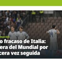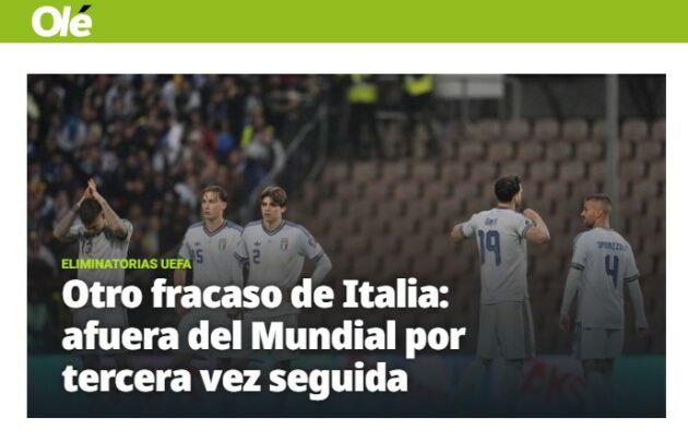 Breve ma chiarissimo il titolo de L’Équipe – più importante quotidiano sportivo francese – che scrive: “Ciao Italia“. Più netto e duro il commento di Marca: “L’Italia, il più grande dramma del calcio Mondiale”. All’interno del pezzo di Marca si legge poi un pensiero comune tra gli italiani ormai da diversi anni: “Una cosa impensabile in un’altra epoca, ma ormai è diventata la normalità: un Mondiale senza la Nazionale”. AS usa invece un modo di dire italiano: “Porca miseria, Italia!”. Mentre il quotidiano portoghese A Bola scrive: “Che tragedia, l’Italia ancora fuori dal Mondiale”. Titoli diversi, con un pensiero comune: il fallimento dell’Italia è ormai sotto gli occhi di tutti. Un risultato che arriva anche dall’altra parte del mondo, con Olé che scrive: “Un altro fallimento per l’Italia: Fuori dal Mondiale per la terza volta consecutiva”.