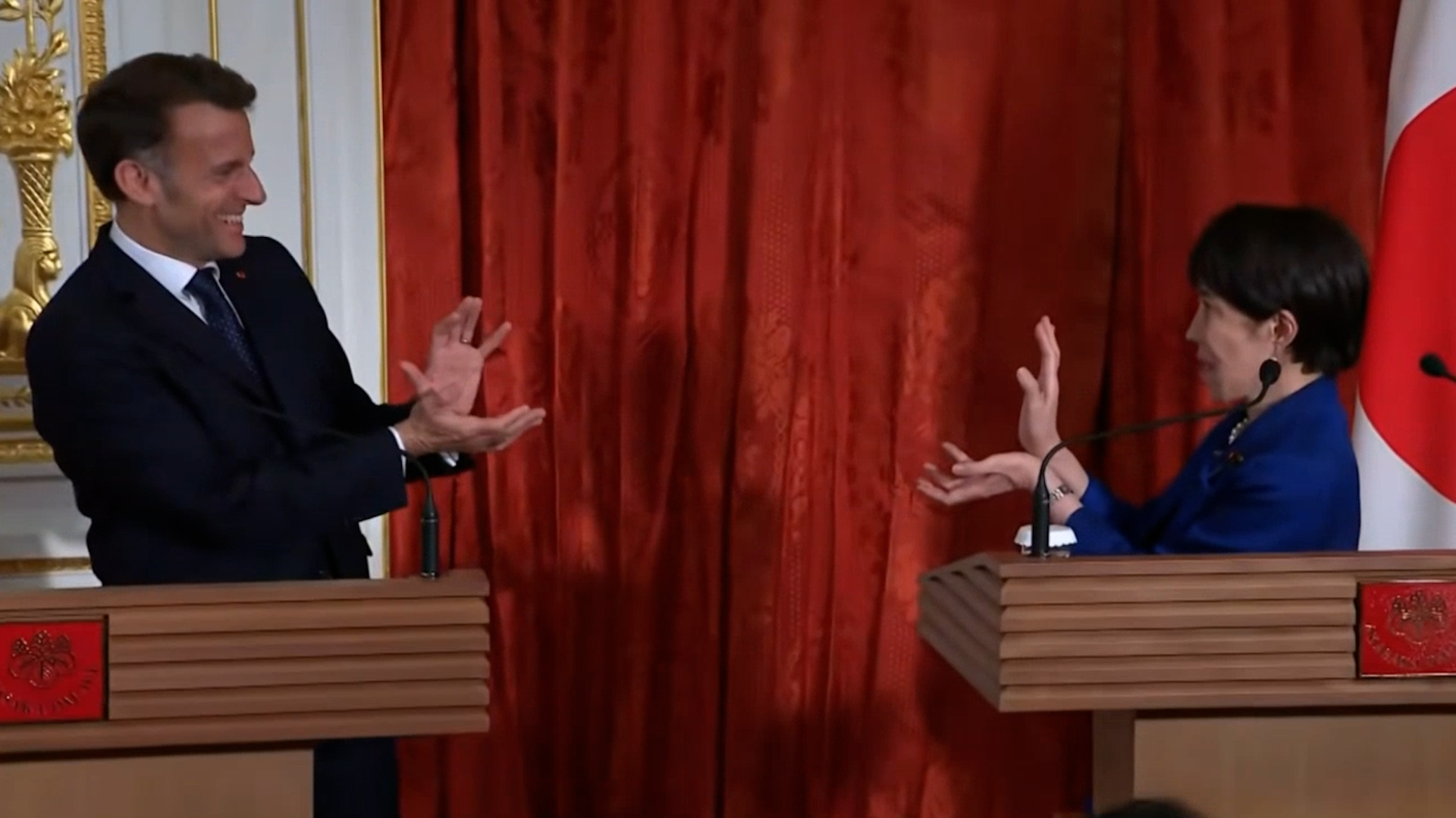 Emmanuel Macron e la premier giapponese Takaichi si salutano in stile Dragon Ball imitando l'”onda energetica”