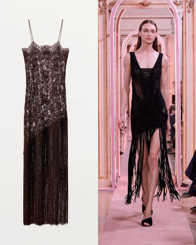 Le frange tornano protagoniste, ma in una versione più teatrale e dinamica, pensata per farsi notare ad ogni passo. Da Bottega Veneta diventano parte integrante di cappotti scultura che si muovono con il corpo, mentre Etro le applica su blouson fluidi, trasformando il movimento in un elemento estetico. Più sottili e discrete da Giada, dove compaiono su pantaloni e gonne come dettagli in movimento. Il fast fashion intercetta subito il trend: Zara rielabora l’idea vista da Elisabetta Franchi, portando in versione accessibile abiti lingerie con frange, perfetti per un look da sera.