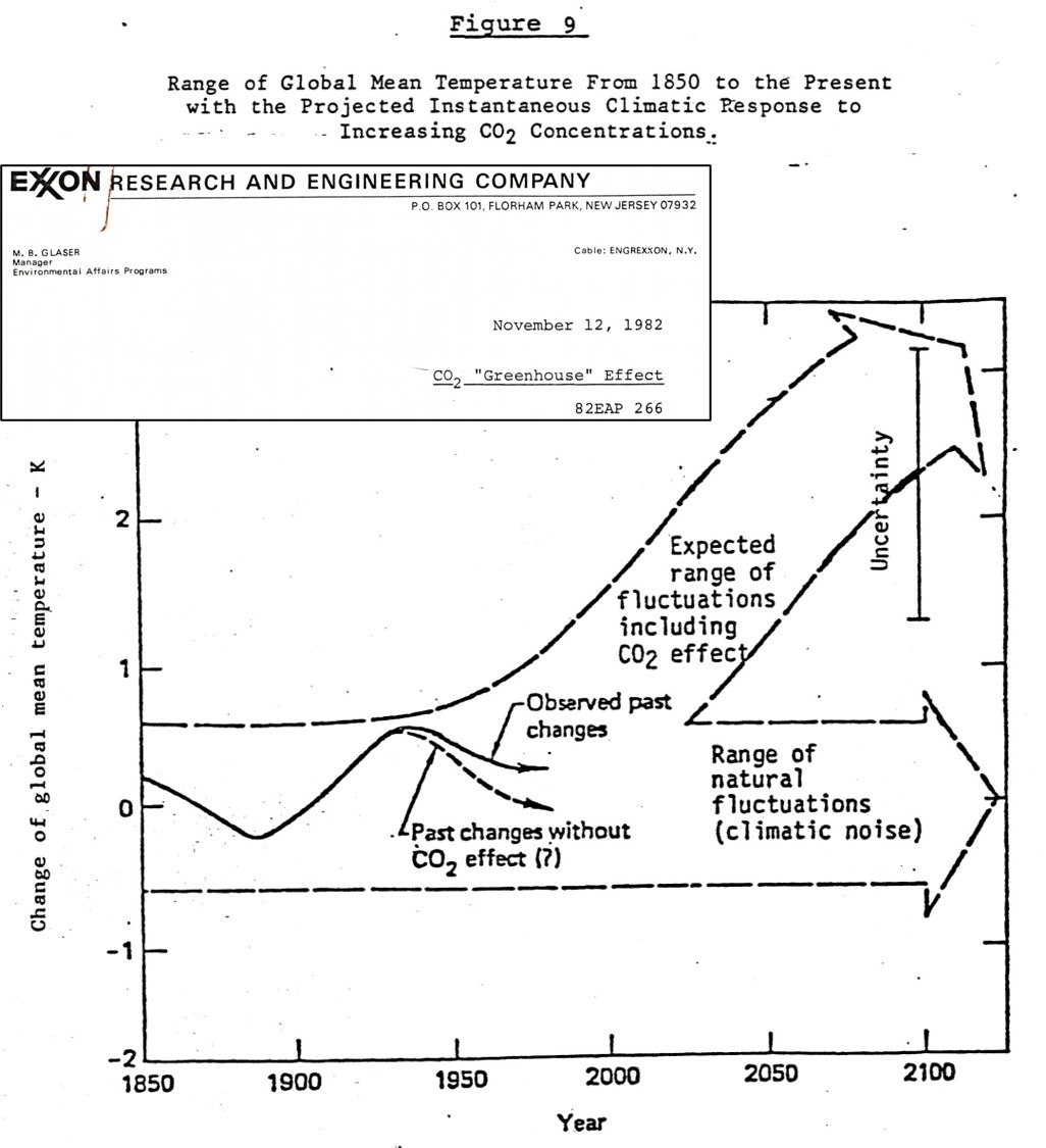 Nel 1982, Marvin B. Glaser, responsabile dei programmi per gli affari ambientali di Exxon, inviò una lettera circolare a 15 dirigenti e manager Exxon, allegando un documento di revisione tecnica intitolato “CO2 Greenhouse Effect, A Technical Review”, un rapporto tecnico, preparato dalla divisione di coordinamento e pianificazione della stessa compagnia (Hall, S., Exxon Knew about Climate Change almost 40 years ago, Scientific American, October 26, 2015).