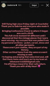 Il problema è arrivato dopo. Una volta finita l’esibizione, il guardaroba “storico” della popstar è sparito nel nulla. E da lì è scattata la mossa più contemporanea possibile: Instagram. Madonna ha infatti pubblicato una storia in cui offre una ricompensa a chiunque restituisca i capi scomparsi, specificando che si tratta di giacca, corsetto e abito.