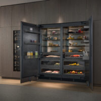Sulla stessa linea di bellezza/efficienza, Gaggenau, brand di lusso per gli elettrodomestici a livello professionale ha pensato bene di usare la storica villa Necchi di Campiglio per Presence, un padiglione in vetro immerso nei giardini, per raccogliere le novità. Anche qui siamo in cucina: il forno della serie Expressive è incorniciato da una scala centrale in travertino; la serie Minimalistic si staglia su uno sfondo di vetro specchiato e fumé retroilluminato; i piani cottura Vario sono integrati in basalto e legno annerito. Ma dove appoggiare una padella? Siamo di fronte a una superficie liscia, perfetta, finché girando una manopola non si accende una piccola luce, e la base non si scalderà finché non metterai su la pentola…. I centri di refrigerazione e le cantine climatizzate per il vino non solo di una perfetta estetica: se depositi all’interno una bottiglia di rosso a temperatura ambiente, la cantina la porta rapidamente al numero di gradi ottimale, raffredda i bicchieri e chissà cos’altro può fare, provandola. Ma la versa sorpresa è Arredo3, cucine da sogno. Quello che vedi sembra marmo, ma non lo è, e così il legno, ma il vetro è davvero vetro, i pannelli a scomparsa promettono efficienza, e c’è un posto per tutto. Chi ha più bisogno di una sala da pranzo?