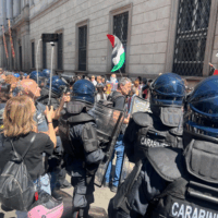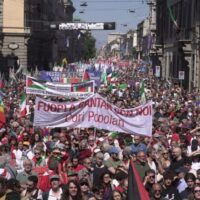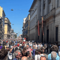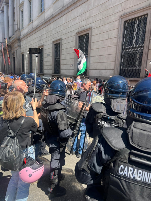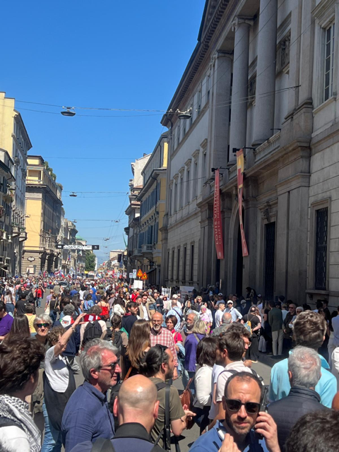 Aspettiamo che il serpentone umano fatto anche di istituzioni e generali gallonanti scivoli via. In un simile contesto io mi sarei vergognata di rappresentare un’istituzione. La lunga marcia dei partigiani continua con rinforzi da ogni arteria fino a piazza San Fedele dove il comizio finale del Coordinamento per la pace di Milano attacca la Brigata Ebraica. Noi intanto proviamo l’ultima via di fuga attraverso la metropolitana di San Babila. Ovviamente blindata.