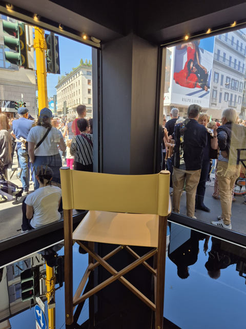 Sono con ospiti stranieri, il neo/eletto politico cantonale Jonathan Santolin, Brant Mcfair e Justin Moon, noti designer di Dallas, guadagniamo centimetri di strada ed entriamo in Casa Armani (sempre angolo Corso Venezia con via Senato). Tra le atmosfere miniminal chic che rievocano le dimore dello stilista, dentro un racconto immersivo di paradisi lontani, fuori, attraverso le vetrine che danno sulla strada, l’inferno.