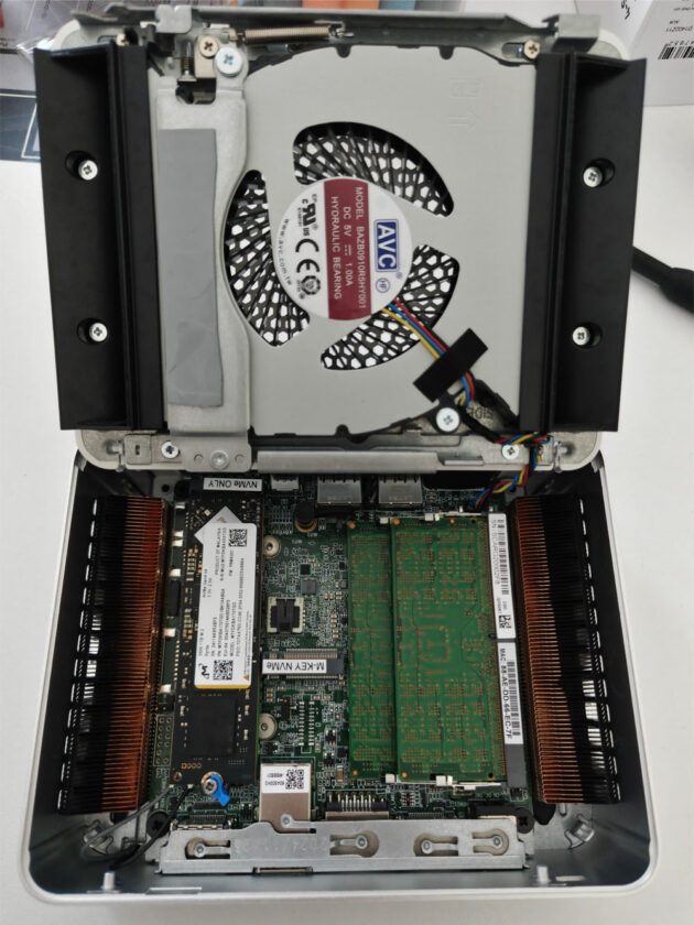 Se già l’esterno del PC evidenzia la cura dei materiali (è certificato per lo standard di resistenza militare MIL-STD-810) e l’attenzione ai dettagli di ASUS, a dare al NUC dell’azienda taiwanese una marcia in più rispetto ad altre soluzioni che abbiamo potuto provare negli scorsi mesi è sicuramente l‘accessibilità del vano per l’upgrade: l’installazione delle memorie è resa molto semplice, e quasi “toolless”, vedendo sulla parte inferiore una levetta (bloccata da una singola vite) permettere di aprire il fondo, che una volta ruotato sulle cerniere che lo collegano alla struttura interna del case, permette di accedere agli slot sia per la RAM che per gli SSD.