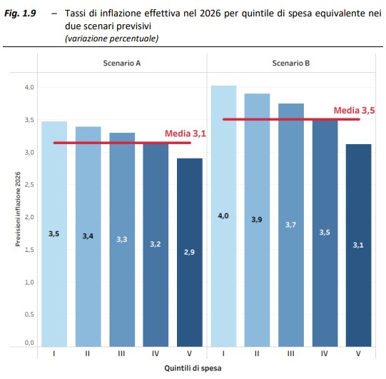 La ragione, che la memoria dell’Upb , è intuitiva. I nuclei con minore capacità di spesa destinano una quota molto più ampia del loro paniere a energia (+37% rispetto alla media) e alimentari (+39%), ovvero le voci che stanno trainando la nuova fiammata dei prezzi. Quella tassa occulta che è l’inflazione è quindi regressiva: colpisce di più chi ha meno margini per assorbirla. Nello scenario base, con prezzi energetici in aumento del 10,4%, quella media si attesta al 3,1% ma per le famiglie del primo quintile (il 20% di popolazione con redditi più bassi) sale al 3,5%. Nello scenario più critico, con l’energia che rincara del 13,4%, l’inflazione complessiva arriverebbe al 3,5% ma con un picco del 4% per i più poveri tocca.