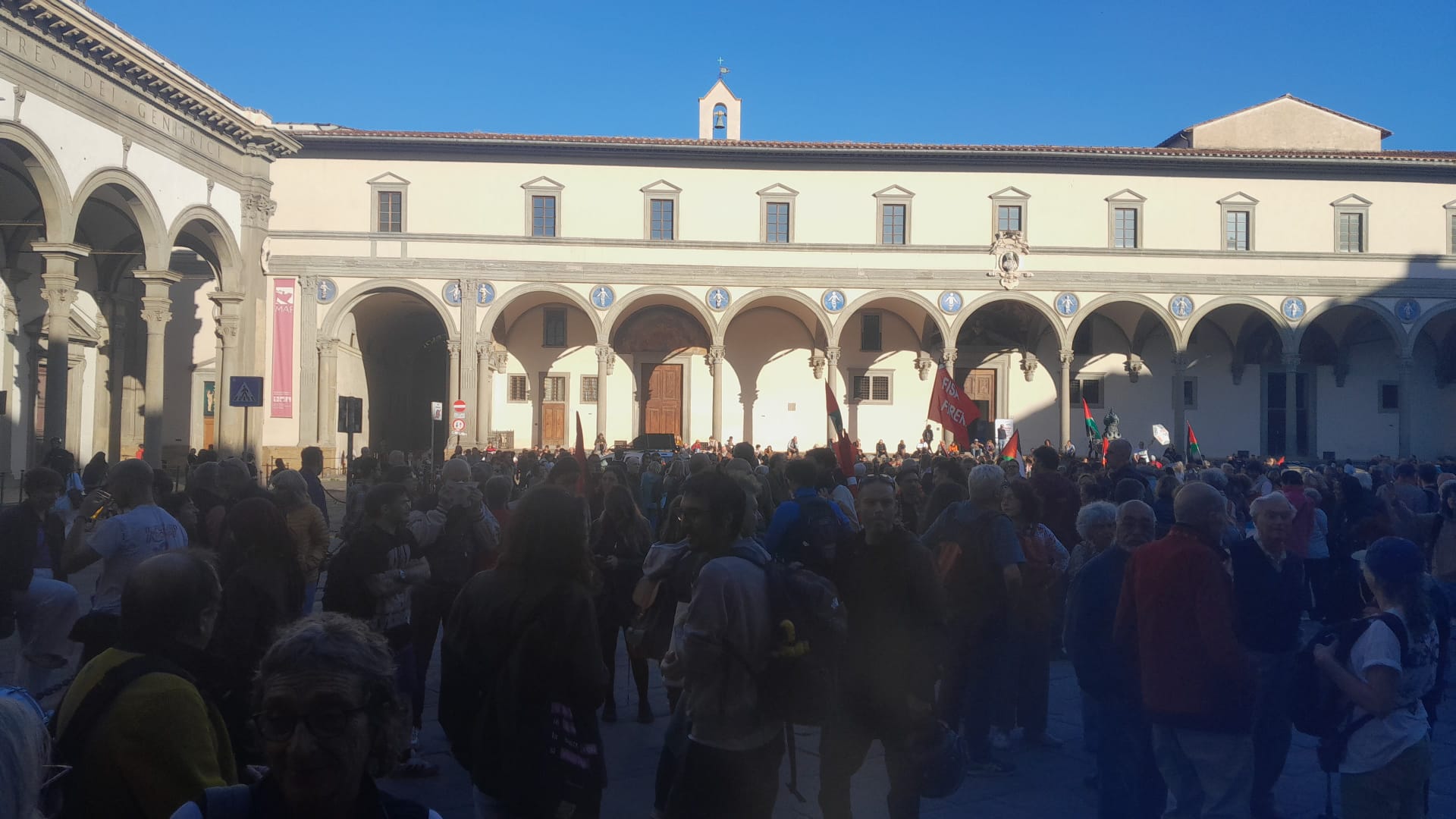 Corteo anche a Firenze con centinaia di persone radunate in solidarietà con la Global Sumud Flotilla. “Equipaggi di mare e di terra contro l’economia di guerra”, si legge nello striscione che affianca quello di Firenze per la Palestina. In piazza bandiere palestinesi e quelle dei sindacati di base e della Cgil, di Rifondazione comunista e dei Carc. “Siamo di fronte all’ennesima violazione del diritto internazionale, siamo di fronte a uno Stato che non rispetta nessuna regola – commenta Bernardo Marasco, segretario Cgil Firenze – Uno Stato che fa un atto criminale nei confronti di qualcuno che sta portando solidarietà. Credo che sia necessario che l’Europa non solo prenda le distanze, ma rompa la collaborazione militare con questo Stato e faccia sentire la massima pressione”. A bordo della Flotilla ricorda Dmitrij Palagi di Sinistra progetto Comune “non c’è solo Antonella Bundu. Ci sono personale medico, volontari, persone esperte di diritto internazionale, quindi abbiamo ovviamente un po’ di ansia verso di lei come verso tutte le altre persone. Non facciamo i nomi e cognomi perché Antonella ha accettato di mettere a disposizione il ruolo pubblico che ha. Ci sono altre persone che hanno un ruolo pubblico minore e quindi le dobbiamo tutelare al massimo”. Dopo una serie di interventi a microfono di sindacati di base, Giovani palestinesi e Firenze per la Palestina, il presidio al grido di ‘Palestina libera‘, si è trasformato in corteo che da piazza Santissima Annunziata si è diretto verso piazza San Marco.