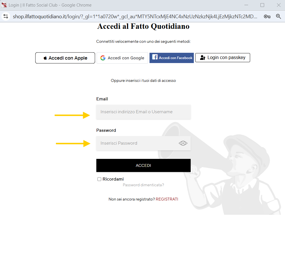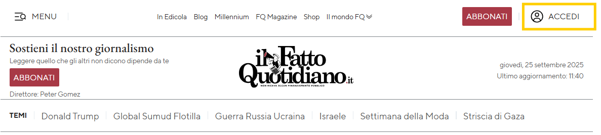 - Inserisci le sue credenziali (email e password) utilizzate per l’abbonamento al Fatto Quotidiano e clicca su “Accedi”: