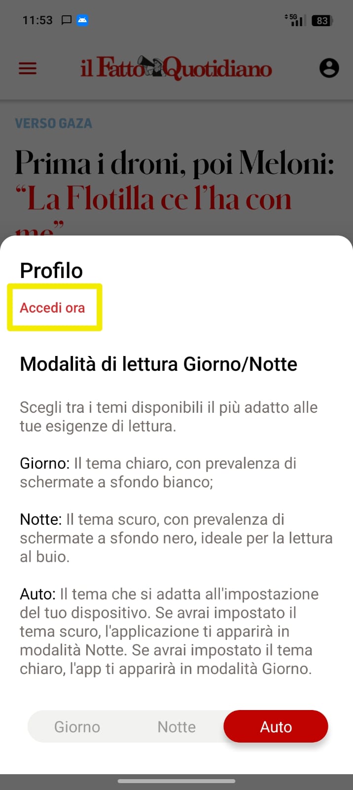 Per accedere all’applicazione Il Fatto Quotidiano, è necessario cliccare sull’icona dell’Area Profilo in alto a destra e poi su ACCEDI ORA.