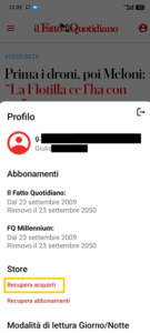Se ti sei abbonato da iPad, iPhone su iTunes: potrai leggere l’edizione digitale del quotidiano sul suo PC o su altri sistemi operativi effettuando l’accesso sull’app e cliccando sul tasto “Recupera Acquisti”.