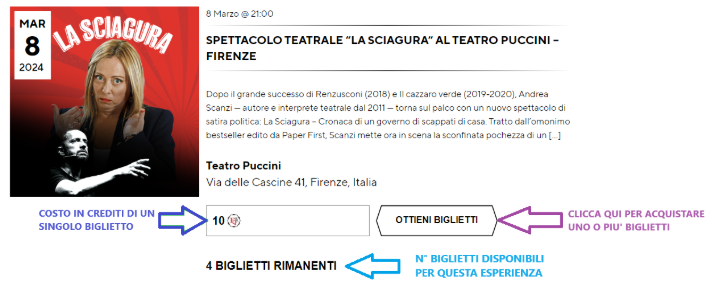 Una volta ottenuti i crediti, potrai usarli per acquistare biglietti per eventi, spettacoli, copie del quotidiano, copie del magazine, corsi o altro, che troverai nella sezione “Esperienze”, o “Prodotti”.