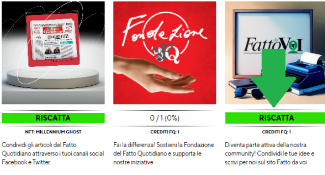 Una volta accumulati sufficienti Crediti FQ, sarà possibile riscattare delle ricompense, come prodotti (copie digitali del quotidiano o del mensile Millennium) o biglietti per esperienze virtuali o dal vivo (ad esempio biglietti per i nostri spettacoli teatrali).