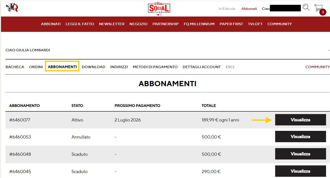 1. accedi alla sezione “Abbonamenti” dal menu del sito o clicca qui: Gestione Abbonamenti