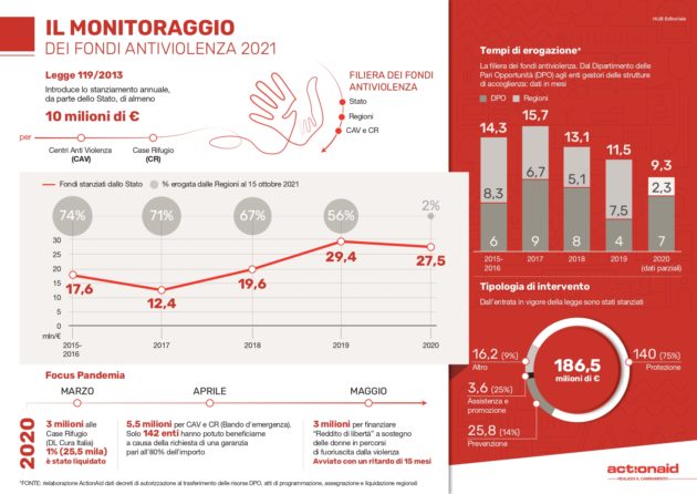 Non è bastata la pandemia a far cambiare rotta alla politica e alle amministrazioni locali nel contrasto alla violenza di genere. Tempi lunghissimi per l’erogazione delle risorse, impedimenti burocratici e mancanza di interventi strutturali che incidano sulle cause della violenza. Questa la fotografia scattata da ActionAid con il rapporto per il 2021 sulle politiche e sul sistema antiviolenza in Italia attraverso il monitoraggio e l’analisi dei fondi statali previsti dalla legge 119/2013 (legge sul femminicidio). A dispetto delle misure straordinarie decise dal Governo nel 2020 per l’allarme della crescita delle richieste di aiuto, a essere oggi effettiva è solo una minima parte delle risorse extra e dei nuovi strumenti per far fronte alle esigenze delle donne che hanno subito violenza durante la pandemia. Sono serviti in media 7 mesi per trasferire le risorse dal Dipartimento Pari Opportunità alle Regioni, che, ad oggi, risultano aver erogato solo il 2% dei fondi complessivi, e in sole la Liguria e l’Umbria. Qui il report.