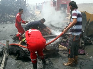 (140521) — TRIPOLI, May 21, 2014 (Xinhua) — Firefighters extinguish fire at the explosion site in Salaheddin district of Tripoli, Libya, May 21, 2014. Explosions and gunfire took place at midnight in the capital city. (Xinhua/Hamza Turkia)