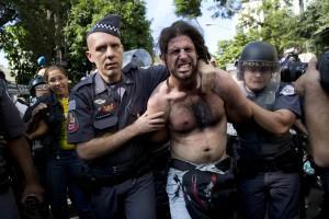 A protester is detained by police during a demonstration demanding better public services and protesting the money spent on the World Cup soccer tournament in Sao Paulo, Brazil, Thursday, June 12, 2014. Brazilian police clashed with anti-World Cup protesters trying to block part of the main highway leading to the stadium that hosts the opening match of the tournament. (AP Photo/Rodrigo Abd)