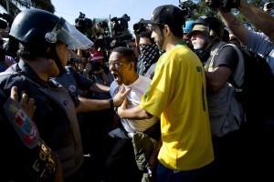 A protestor argues with police during a demonstration demanding better public services and protesting the money spent on the World Cup soccer tournament in Sao Paulo, Brazil, Thursday, June 12, 2014. Brazilian police clashed with anti-World Cup protesters trying to block part of the main highway leading to the stadium that hosts the opening match of the tournament. (AP Photo/Rodrigo Abd)