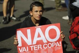 A protester holds a sign that reads in Portuguese "There won’t be a Cup!" during a demonstration demanding better public services and protesting the money spent on the World Cup soccer tournament in Sao Paulo, Brazil, Thursday, June 12, 2014. Brazilian police clashed with anti-World Cup protesters trying to block part of the main highway leading to the stadium that hosts the opening match of the tournament. (AP Photo/Nelson Antoine)