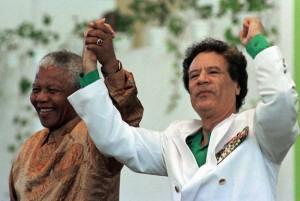 FILE – In this Oct. 29, 1997 file photo, Libyan President Moammar Gadhafi, right, and South African President Nelson Mandela salute the crowd as they arrive at the congress center in Zuwarah, Libya, 60 miles (100 kilometers) west of Tripoli. South Africa’s president Jacob Zuma says, Thursday, Dec. 5, 2013, that Mandela has died. He was 95. (AP Photo/Enric Marti, File)