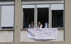 Medical personnel, showing a banner reading "hematology students greet the pope", listen to the announcement that Pope Francis visit at Policlinico Gemelli Hospital was canceled, in Rome, Friday, June 27, 2014. Pope Francis has canceled a planned visit to one of Rome’s main hospitals — the latest in a string of ailments that have raised questions about the 77-year-old pontiff’s health. Francis had been due to visit the Gemelli hospital and celebrate a Mass there Friday afternoon. (AP Photo/Alessandra Tarantino)