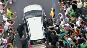 In this image from video, a crowd mobs the silver Fiat carrying Pope Francis through Rio de Janeiro on Monday, July 22, 2013. Ecstatic believers forced the closed Fiat to stop several times as they swarmed around during the drive from the airport to an official opening ceremony in the center of the city. (AP Photo)