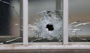 A bullet’s impact is seen on a window at the scene after a shooting at the Paris offices of Charlie Hebdo, a satirical newspaper, January 7, 2015. Eleven people were killed and 10 injured in shooting at the Paris offices of the satirical weekly Charlie Hebdo, already the target of a firebombing in 2011 after publishing cartoons deriding Prophet Mohammad on its cover, police spokesman said. Five of the injured were in a critical condition, said the spokesman. Separately, the government said it was raising France’s national security level to the highest notch. REUTERS/Jacky Naegelen (FRANCE – Tags: CRIME LAW MEDIA)