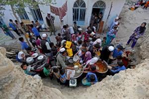 Afghan villagers flock around free food donated by other villagers as they prepare to break their fast during the holy month of Ramadan in Kabul, Afghanistan, Thursday, July 3, 2014. Ramadan is a Muslim holy month of fasting during which Muslims abstain from food, drink and other pleasures from sunrise to sunset. It is the time Muslims believe God started to reveal the Quran to the Prophet Muhammad. For believers, Ramadan is meant to be a time of reflection and worship, remembering the hardships of others and being charitable. (AP Photo/Rahmat Gul)