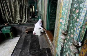 Kashmiri women pray at the entrance of the shrine of Shah-e-Hamdan during the holy month of Ramadan in Srinagar, India, Tuesday, July 1, 2014. Muslims across the world are observing the holy fasting month of Ramadan, where they refrain from eating, drinking and smoking from dawn to dusk. (AP Photo/Mukhtar Khan)