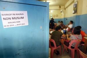 People sit inside a coffee shop that opens its business for non-Muslims only, during the third day of Ramadan in Banda Aceh, Aceh province, Indonesia, Tuesday, July 1, 2014. During Ramadan, the holiest month in Islamic calendar, Muslims refrain from eating, drinking, smoking and sex from dawn till dusk. Writings on the flyer attached on the door of the coffee shop read: "For non-Muslims only." (AP Photo/Heri Juanda)