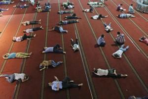 Indonesian Muslim men take a nap as they wait for the time to break their fast after mid-day prayer at Istiqlal Mosque in Jakarta, Indonesia, Wednesday, June 2, 2014. Muslims around the world are observing Ramadan, the holiest month in Islamic calendar, where they refrain from eating, drinking, smoking and sex from dawn to dusk. (AP Photo/Tatan Syuflana)