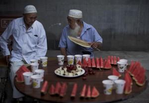 Chinese Muslim men chat as they wait for the time to break their fast during the Muslim holy month of Ramadan at the Niujie mosque, the oldest and largest mosque in Beijing, China Wednesday, July 2, 2014. Students and civil servants in China’s Muslim northwest, where Beijing is enforcing a security crackdown following deadly unrest, have been ordered to avoid taking part in traditional fasting during the Islamic holy month of Ramadan. (AP Photo/Andy Wong)