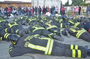 Un flash mob sotto uno dei monumenti nazionali più celebri per denunciare i tagli al corpo dei vigili del fuoco