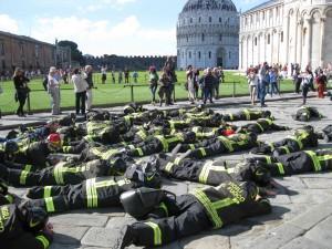 I vigili del fuoco “finti morti” per protestare contro i tagli del governo