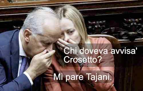 Tajani: “Non sapevo che Crosetto fosse a Dubai”. Crosetto: “Ma allora sei stronzo!” (Tommaso Ari Moscati)