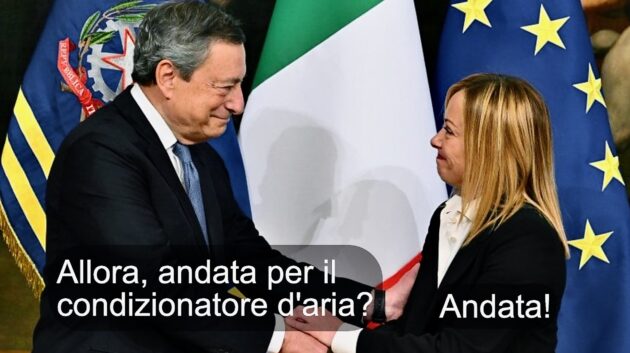 La Meloni sull’attacco Usa contro l’Iran: “Non condanno né condivido, non ho elementi per prendere una posizione”. La posizione dell’Italia nel Global Gender Gap Index è all’85° posto. “Quel posto che non c’è” è una canzone dei Negramaro. Il Negramaro è un vitigno pugliese a bacca nera. Il Nera è un fiume che sfocia nel Tevere. Il Tevere è anche detto “biondo” per il colore dato dalla presenza di sabbia e limo. Il limo è una varietà di agrume napoletana, praticamente impossibile da trovare nei negozi, soprattutto quelli italiani. Gli italiani, secondo Leo Longanesi, sono “buoni a nulla, ma capaci di tutto”. MORALE: La Meloni è buona a nulla, ma capace di tutto. (Giancarlo Gismondo)