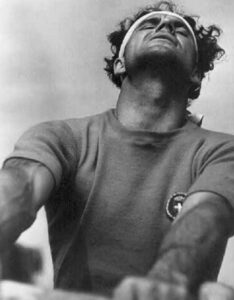 Mario Checcacci, infine, è ancora arruolato nell’esercito ma è una cosa temporanea, nel suo orizzonte forse c’è la divisa di controllore sul filobus, chissà. La faccia alterata dallo sforzo sui remi, le labbra fini e serrate, i capelli bohémien tenuti su da una bandana bianca, lo sguardo accigliato, gli occhi quasi a fessura e un po’ infossati che cercano un orizzonte: la figura di Checcacci – così marina, così corsara – diventerà celebre nel mondo perché sarà resa immortale da uno dei primi piani inventati da Leni Riefensthal, la regista del nazismo, in Olympia, il film ufficiale sui Giochi olimpici di Berlino. Come per tutte le foto di quell’epoca Checcacci dimostra più anni dei 26 che ha. Lo scatto lo trova in un’estetica così perfetta da apparire di posa: tira il remo con la testa piegata all’indietro, ha gli occhi quasi del tutto chiusi, obnubilato dalla fatica, una leggera smorfia sul volto, i muscoli in tensione, la capellatura senza ordine. Riefensthal inserirà lo scatto di Checcacci anche dentro un libro fotografico e col tempo l’immagine del vogatore livornese con la faccia da pirata si trasformerà in un’opera d’arte. Qualche anno fa, in Germania, è andato all’asta l’originale: è stato aggiudicato per quasi 2mila euro.