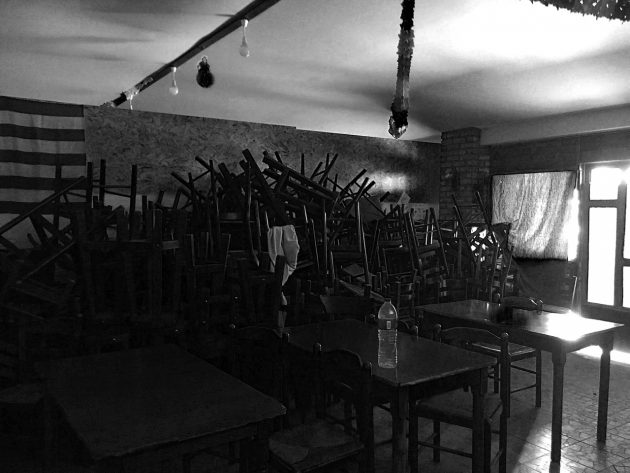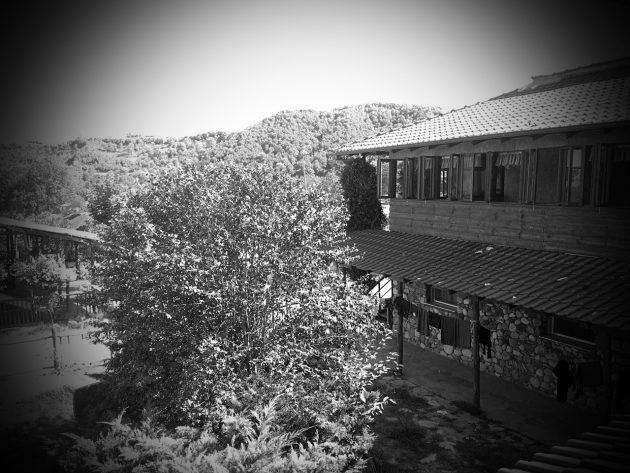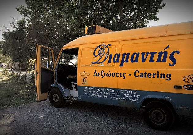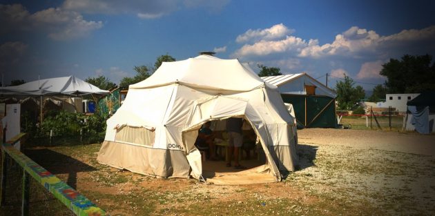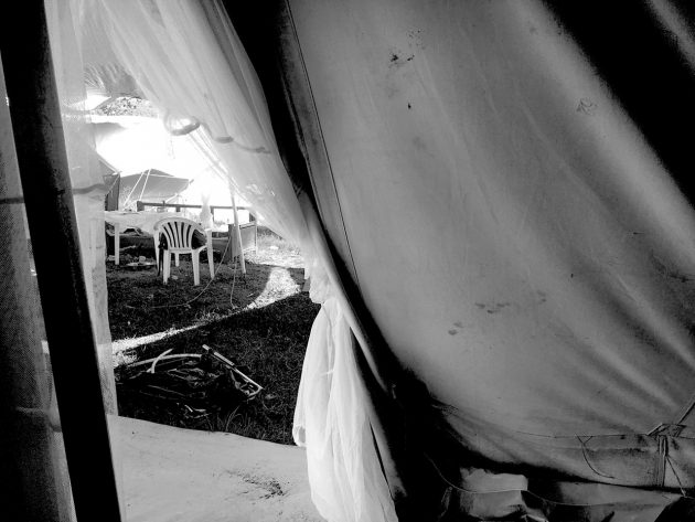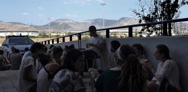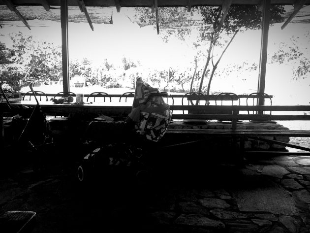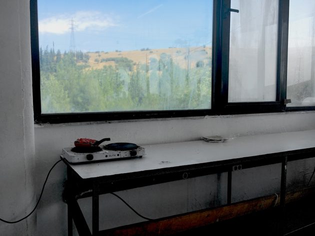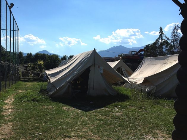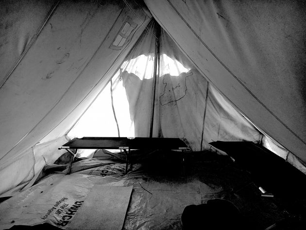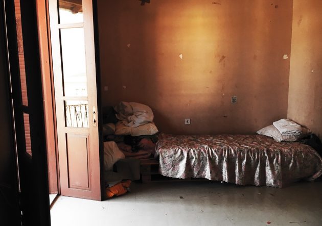 Per raggiungere Petra servono due ore di viaggio se parti da Katerini , tre se arrivi da Salonicco . Quando passi il campo da basket abbandonato sulla sinistra e cominci a vedere il monte Olimpo solo se ti sporgi sul volante, allora sei nella direzione giusta. Poi sono sentieri che si fanno sempre più stretti, tornanti e un cancello in mezzo alle foglie. Il campo di tende color ocra si apre all’improvviso quando giri l’ultima curva e rimane solo lo strapiombo. Lì, in cima, fino agli anni ’50 c’era una clinica per i malati psichiatrici. Di quel tempo di fantasmi e dolori sono rimasti i corridoi scrostati di un edificio color mattone e una pagina della bibbia scritta in italiano e appiccicata contro il muro.