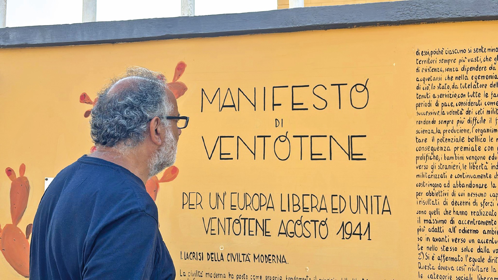 Il confino era una misura preventiva di polizia, non una condanna giudiziaria, e per finirci era persino sufficiente aver raccontato una barzelletta antifascista. A Ventotene, i cameroni in cui vivevano i confinati sono stati demoliti nel 1980: tonnellate di calcinacci, come raccontano gli autoctoni, che finirono a mare, a nord dell’isola, dove ci sono pure i resti di villa Giulia, la dimora in cui l’imperatore Augusto esiliò la figlia Giulia, accusata di tradire a ripetizione il marito generale Agrippa. In compenso, a voler riparare lo sfregio demolitivo alla memoria, oggi ci sono targhe e lapidi a iosa. Non solo: lo slargo davanti alla zona dei cameroni ha la dignità di “piazza del confino politico”. Lo spirito di Ventotene si è trasfigurato in una sorta di marketing politico-culturale che diventa visibile soprattutto in piazza Castello, il nucleo centrale dell’isola, dove il Manifesto è un diventato un murale su uno sfondo giallo ocra. È stato inaugurato appena un anno fa. A conferma che la riscoperta dell’utopia spinelliana è direttamente proporzionale ai disastri odierni dell’Unione europea.