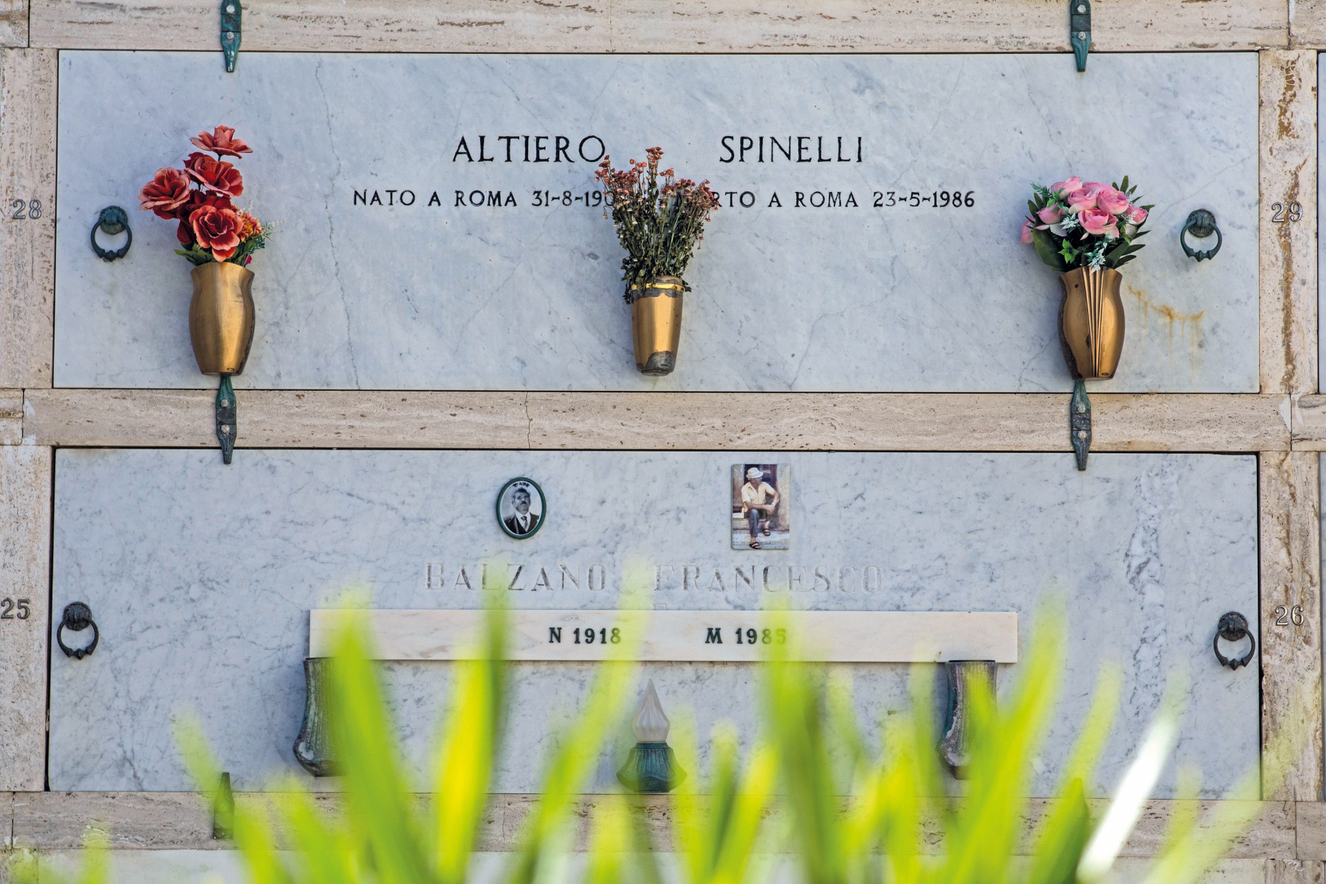 Il cimitero di Ventotene è proprio di fronte al nostro albergo, in cima a una collinetta. Si scende verso Cala Rossano, dove c’è una spiaggia, e poi si affronta una lunga scalinata. Il cancello è chiuso da una catena con lucchetto. Le ceneri di Spinelli sono in loculo nell’ala sinistra del camposanto, entrando dal cancello. Nome e cognome, date di nascita e di morte e una bandiera blu dell’Europa con le dodici stelle, afflosciata su se stessa. La visita è breve, il cimitero è piccolo. Sole e silenzio. Soletudine. Una turista vede il cancello aperto ed entra. C’è il rischio di andare via e chiuderla dentro. Ma la donna esce subito. Si è solamente guardata attorno. Il cancello si può rinserrare, per poi andare a restituire la chiave al negozio. «Grazie di tutto, e scusi il ritardo, sono le undici». «Non vi preoccupate, c’è chi le riporta dopo un giorno». Sempre sulla fiducia.