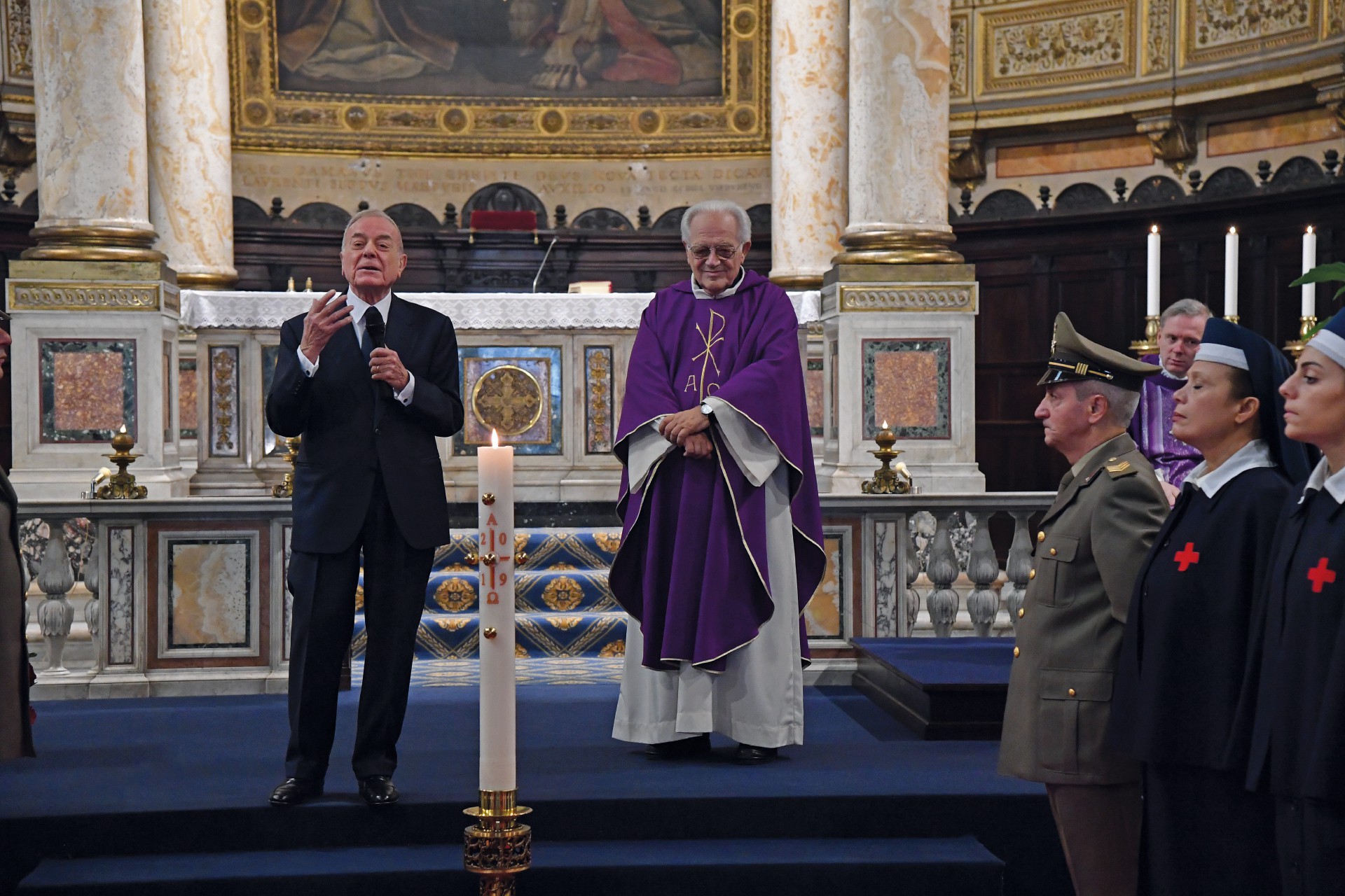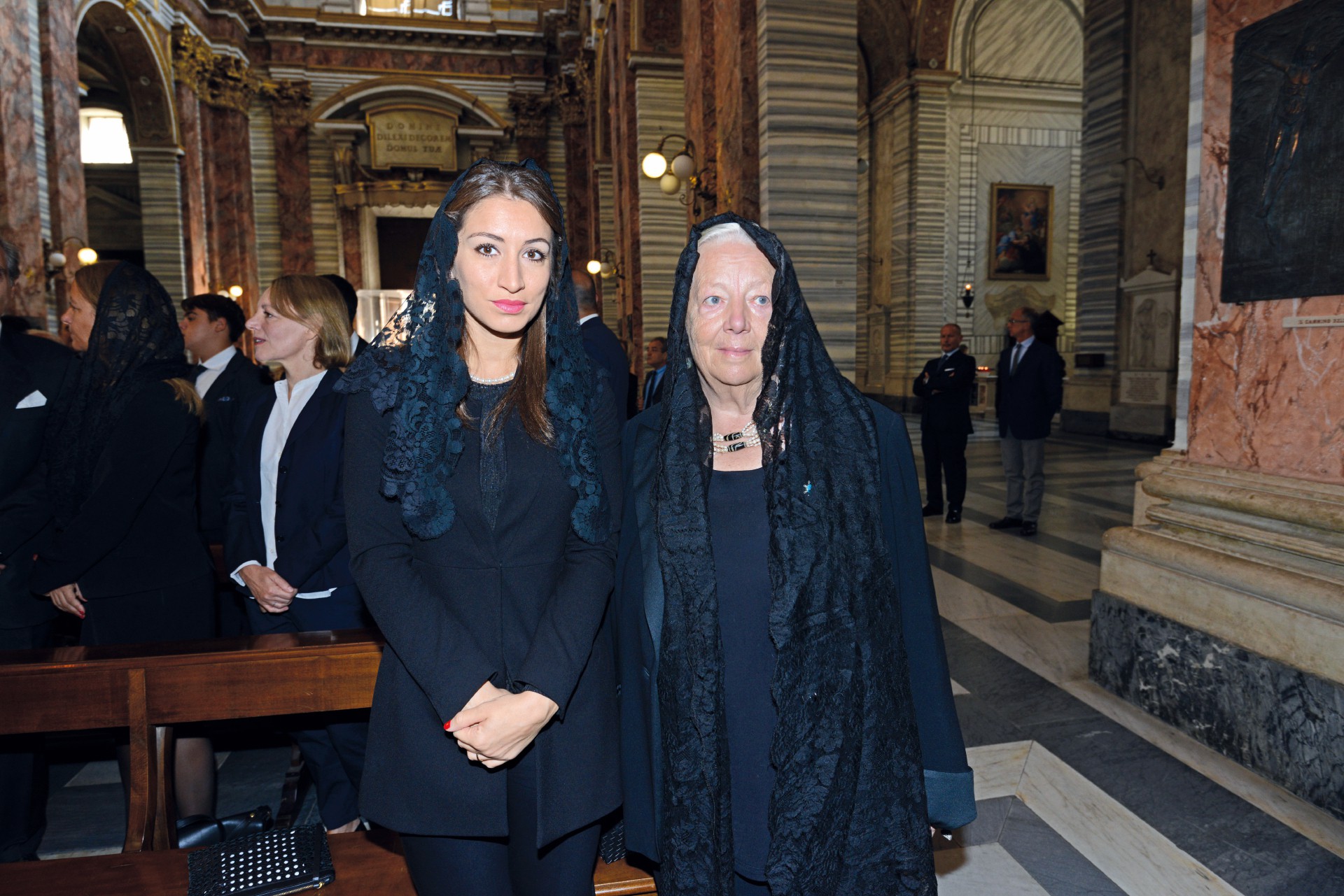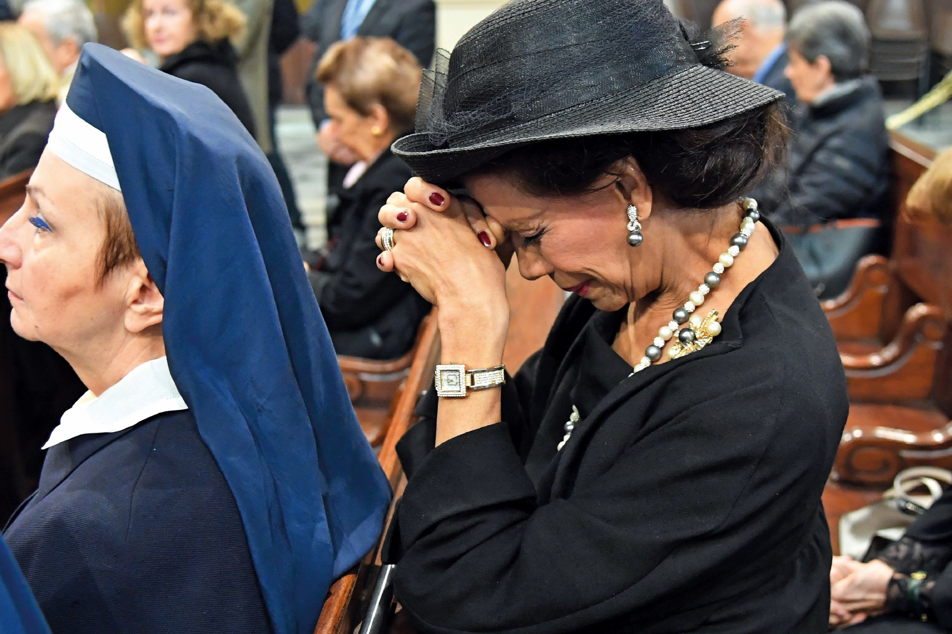 Estrazioni del lutto. Scene da funerali aristocratici a Roma. Sopra, la contessa Marisela Federici – regina dei salotti della Capitale – è in ginocchio durante le esequie di Maria Pia Fanfani, vedova dello statista dc Amintore, morta nel 2019. A sinistra, i funerali nel 2016 del principe Carlo Giovanelli, genero di Guglielmo Marconi e protagonista della Dolce Vita: le due donne sono rispettivamente la nuora e la cognata del principe