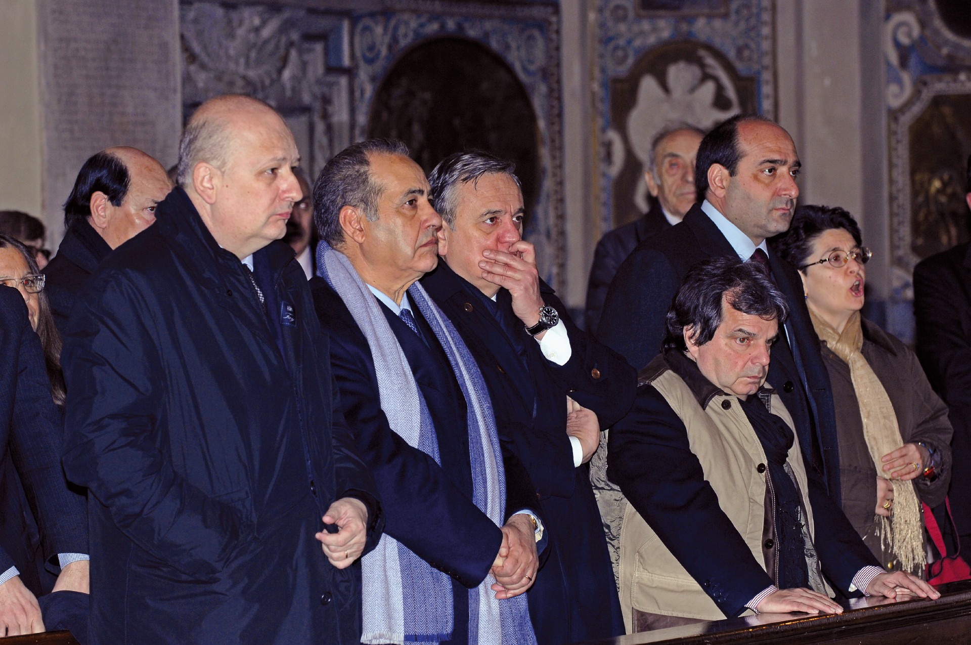 Chiagni e fotti. E venne il turno della politica. Abbiamo scelto una pattuglia di azzurri d’antan schierata in prima fila a una messa di suffragio, a Roma, per la mamma di Silvio Berlusconi, Rosa. Da sinistra: Bondi, Pisanu, Sacconi, Brunetta e Crimi. Sotto, Gianni Letta durante un’orazione funebre: il Gran Visir dell’epopea berlusconiana è famoso per coltivare l’arte del necrologio