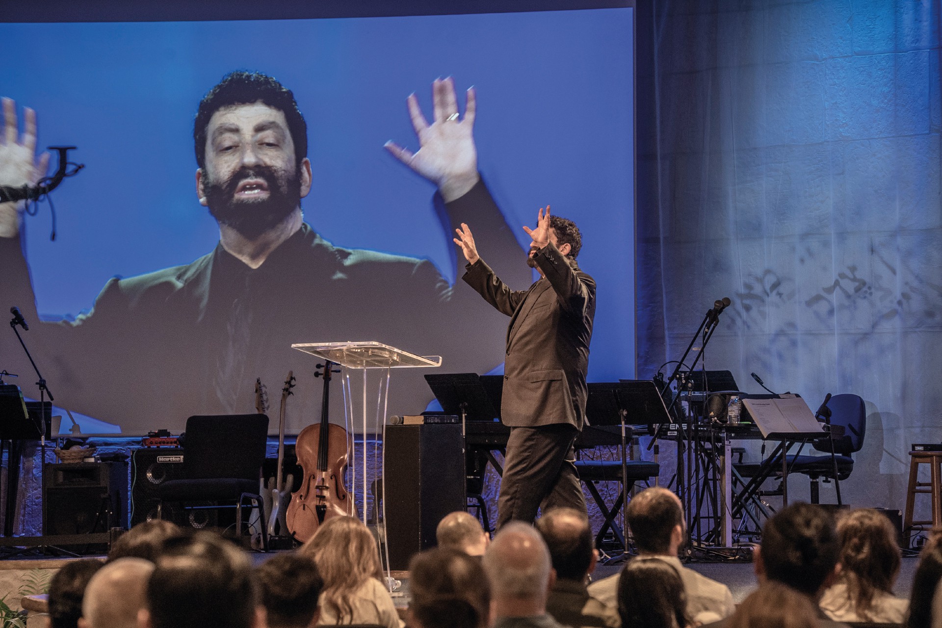 Quando entra in scena, Jonathan Cahn ha l’aria di un profeta contemporaneo. Capelli neri ricci che incorniciano un volto severo, barba piena e curata, veste interamente di nero: camicia, pantaloni e giacca. Con The Harbinger, il romanzo profetico che collega l’11 settembre alla Bibbia, Cahn diventa un autore da milioni di copie e una voce ascoltata dalla destra cristiana americana. I suoi libri — da The Mystery of the Shemitah a The Return of the Gods — mescolano teologia e geopolitica, storia e profezia, fino a farne una figura a metà tra il pastore e l’oracolo, capace di leggere nella cronaca americana i segni dell’Apocalisse. Sul grande schermo alle sue spalle, lo sfondo alterna tonalità di blu e viola: uno show made in Usa, ma in salsa ebraica. La voce è profonda e modulata, capace di passare dal sussurro all’invocazione con la naturalezza di chi ha trasformato la predicazione in un’arte di regia. È un uomo che domina lo spazio senza sforzo, con la sicurezza di chi sa di essere già, per molti, una figura profetica.