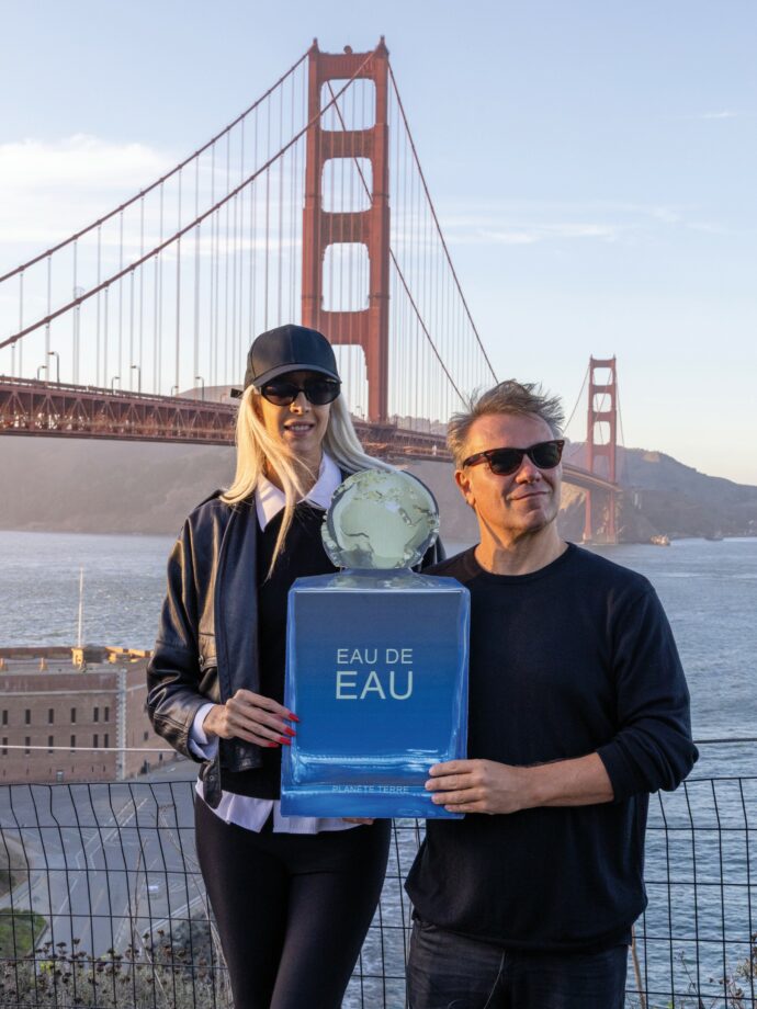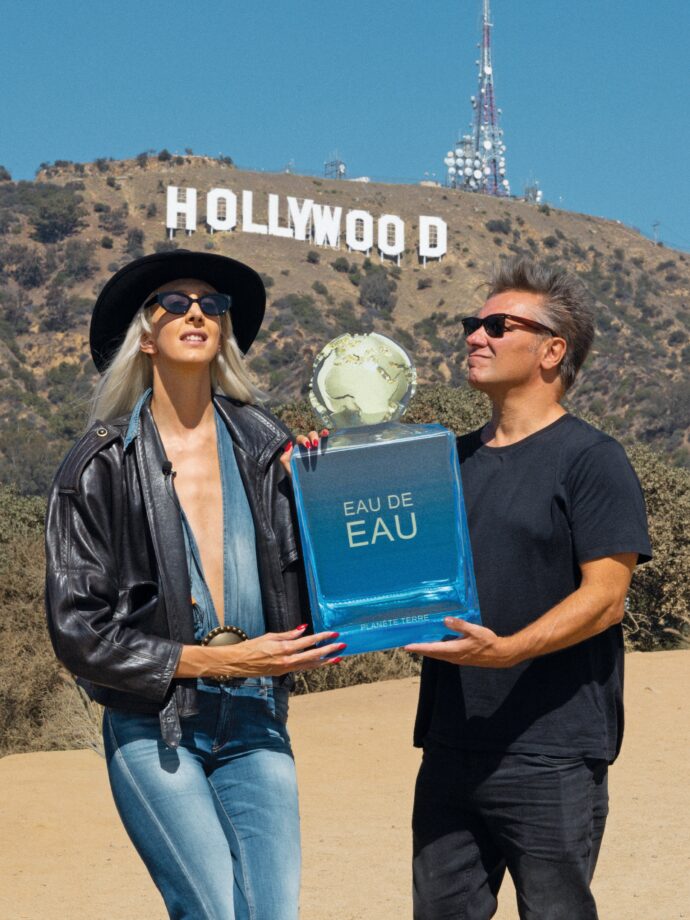 Se potessi scegliere un Paese al mondo dove esporre il tuo progetto d’arte, dove andresti? A noi quel Paese ci è piovuto tra le mani, temevamo che alla dogana ci arrestassero, ma siamo partiti lo stesso. Un anno e mezzo fa nel numero di Millennium “Non piove, governi ladri” è uscita un’immagine nella terza di copertina, firmata Papeschi ovviamente, che ritrae una boccetta d’acqua dal titolo “EAU DE EAU”, ha le fattezze di un profumo e il tappo è un globo dorato a forma di pianeta Terra. Il brand che marchia il vetro bluastro si chiama PLANÈTE TERRE, è francese. A maggio 2025 quella boccetta è stata esposta davanti a 600 persone. È cambiata leggermente la forma, ma la sostanza è sempre quella: in un futuro distopico dove l’acqua se la potranno permettere solo i ricchi, questa sarà venduta a peso d’oro, in un costosissimo flacone che pare quello di una fragranza di lusso.